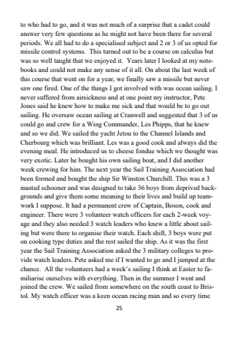 25to who had to go, and it was not much of a surprise that a cadet could answer very few questions as he might not have been there for several periods. We all had to do a specialised subject and 2 or 3 of us opted for missile control systems. This turned out to be a course on calculus but was so well taught that we enjoyed it. Years later I looked at my notebooks and could not make any sense of it all. On about the last week of this course that went on for a year, we finally saw a missile but never saw one fired. One of the things I got involved with was ocean sailing. I never suffered from airsickness and at one point my instructor, Pete Jones said he knew how to make me sick and that would be to go out sailing. He oversaw ocean sailing at Cranwell and suggested that 3 of us could go and crew for a Wing Commander, Les Phipps, that he knew and so we did. We sailed the yacht Jetou to the Channel Islands and Cherbourg which was brilliant. Les was a good cook and always did the evening meal. He introduced us to cheese fondue which we thought was very exotic. Later he bought his own sailing boat, and I did another week crewing for him. The next year the Sail Training Association had been formed and bought the ship Sir Winston Churchill. This was a 3masted schooner and was designed to take 36 boys from deprived backgrounds and give them some meaning to their lives and build up teamwork I suppose. It had a permanent crew of Captain, Boson, cook and engineer. There were 3 volunteer watch officers for each 2-week voyage and they also needed 3 watch leaders who knew a little about sailing but were there to organise their watch. Each shift, 3 boys were put on cooking type duties and the rest sailed the ship. As it was the first year the Sail Training Association asked the 3 military colleges to provide watch leaders. Pete asked me if I wanted to go and I jumped at the chance. All the volunteers had a week%u2019s sailing I think at Easter to familiarise ourselves with everything. Then in the summer I went and joined the crew. We sailed from somewhere on the south coast to Bristol. My watch officer was a keen ocean racing man and so every time