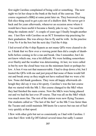 287first night Caroline complained of being cold or something. The next night we let her sleep in the bunk at the back of the caravan. That course organised a BBQ at some point later on. They borrowed a long fish slice thing used to get a pie out of a shallow dish. We never got it back and for years afterwards, whenever an occasion arose where it would have been useful it became a family joke to say ,%u201cwe need the thing the students stole%u201d. A couple of years ago I finally bought another one. I last flew with Caroline on an SCT formation trip practising for their graduation. She was always fun to fly and be with. In the practise I was No 4 in the box but the next day I led the 4 ship. I led several of the 4 ship flypasts as not many QFIs were cleared to do so. I think that we flew over a viewing point then did a couple of dumbbells before coming in for a run and break. One I remember, but I do not know which one, was a bit difficult. We were holding somewhere over Haxby and the weather was deteriorating. At last, we were called in but by now the cloud base was on the minimum limit or perhaps below. A box 4 was not that manoeuvrable. I had to drop down a bit, but I trusted the QFIs with me and just prayed that none of them would fall out and break away as they might not have realised that we were a bit low. None did thank goodness. They were all happy afterwards although they did say it was a bit sporty. Caroline%u2019s was the last course that we started with the Mk 3. Her course changed to the Mk5 when they had finished the main course. Now the Mk3s were being phased out and we had the last ever JP course. That was all on the Mk5 which was much more fun. The rest of the station were now flying Tucanos. Our students called us %u201cThe last of the fast%u201d as the Mk 5 was faster thanthe Tucano and could maintain 300 knots for a navex but ran out of fuel very quickly at that speed. I flew with other girls but not so consistently as I had with Caroline. I note that I flew with Fg Off Gabriel several times but sadly I cannot