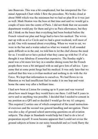 292into Beauvais. This was a bit complicated, but Ian interpreted the Terminal Approach Chart while I flew the procedure. We broke cloud at about 500ft which was the minimum but we had no plan B so it was just as well. Mark Heaton was the boss at that time and said we would get a couple of taxis into the centre of Paris. I did not think that our accounts department would pay for them and give us Paris allowances, but they did, I think on the bases that everything had been booked before the French vetoed our plan and Serge had to have his medical. The wives met up with us at Le Circle and we had a great weekend, well most of us did. One wife moaned about everything. When we went to eat, we were in the bar and a waiter asked us what we wanted. It all sounded quite difficult so in the end, we told him to let the chef choose the meal for us. I would never have picked what they came up with but 15 of us thought it was fabulous if somewhat expensive. The Sunday night%u2019s meal was a bit more low key in a smaller dining room but the French people there were a bit intrigued with us and gave lots of advice. I presume that at some point Serge had his medical. It was only later that we realised that this was a civilian medical and nothing to do with the Air Force. We kept that information to ourselves. We had flown in via Manston as we had insufficient fuel to make it in one hop and went home the same way after a brilliant time. I had now been at Linton for coming up to 8 years and was worried about how much longer they would leave me there. I still had 8 years to serve and so anything was possible. I decided that I needed to cement in my position as a QFI and so decided I would go for my A1 category. This required 2 sorties one of which comprised of the usual instructional exercises and the second was general handling and navigation. There was also a day of ground school answering questions on all aviation subjects. The chaps in Standards would help but I had to do a lot of preparation myself. It soon became apparent that I could not revise the ground subjects at home in our noisy household and so I took Harry the