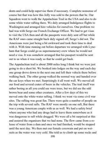 295dents and could help supervise them if necessary. Complete nonsense of course but that was how this Jolly was sold to the powers that be. Our Squadron went to walk the Appalachian Trail in the USA and also to do some white water rafting there. We duly arranged Indulgence flights to Washington and arranged hire vehicles for ourselves. One problem we had was with Serge our French Exchange Officer. We had to get visas to visit the USA then and all the passports were duly sent off but while the RAF ones came straight back duly signed off, Serge%u2019s did not. The Americans were just being a bit awkward and took their time to deal with it. With time running out before departure we arranged with Lyneham that Serge could go as supernumerary crew where he would not need a visa. It was somehow arranged that his passport would be sent out to us when it was ready so that he could get back.The Appalachian trail is about 2000 miles long I think but we were just going to do a short bit. We booked into lodges on the way and each day one group drove down to the next one and left their vehicle there before walking back. The other group walked the normal way and handed over the car keys when we met. Surprisingly it all went well. We moved all our food and several crates of beers in the vehicles. The trail itself was rather boring as all you could see were trees, but we did see the odd brown bear and some other creatures. After a few days of this we moved onto the white-water rafting. I think we went via some civil war sites. The rafting was great fun. There were quite a number of people on the trip with several rafts. The RAF were mostly on one raft, But there was a young American couple with us as well. We had a safety brief where anyone who had any drugs had to leave them somewhere as it was dangerous to raft while drugged. We were all a bit surprised at this and assured the organisers that we had none. The flow came from a release of water from a dam and once we had finished, would be stopped until the next day. We then met our female coxswain and put on wetsuits as the water was very cold. She told us to climb up some rocks and