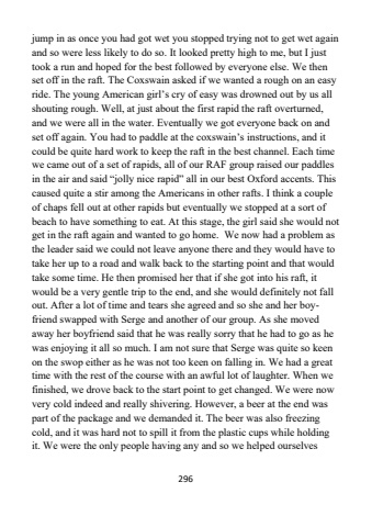 296jump in as once you had got wet you stopped trying not to get wet again and so were less likely to do so. It looked pretty high to me, but I just took a run and hoped for the best followed by everyone else. We then set off in the raft. The Coxswain asked if we wanted a rough on an easy ride. The young American girl%u2019s cry of easy was drowned out by us all shouting rough. Well, at just about the first rapid the raft overturned,and we were all in the water. Eventually we got everyone back on and set off again. You had to paddle at the coxswain%u2019s instructions, and it could be quite hard work to keep the raft in the best channel. Each time we came out of a set of rapids, all of our RAF group raised our paddles in the air and said %u201cjolly nice rapid%u201d all in our best Oxford accents. This caused quite a stir among the Americans in other rafts. I think a couple of chaps fell out at other rapids but eventually we stopped at a sort of beach to have something to eat. At this stage, the girl said she would not get in the raft again and wanted to go home. We now had a problem as the leader said we could not leave anyone there and they would have to take her up to a road and walk back to the starting point and that would take some time. He then promised her that if she got into his raft, it would be a very gentle trip to the end, and she would definitely not fall out. After a lot of time and tears she agreed and so she and her boyfriend swapped with Serge and another of our group. As she moved away her boyfriend said that he was really sorry that he had to go as he was enjoying it all so much. I am not sure that Serge was quite so keen on the swop either as he was not too keen on falling in. We had a great time with the rest of the course with an awful lot of laughter. When we finished, we drove back to the start point to get changed. We were now very cold indeed and really shivering. However, a beer at the end was part of the package and we demanded it. The beer was also freezing cold, and it was hard not to spill it from the plastic cups while holding it. We were the only people having any and so we helped ourselves
