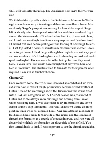 297while still violently shivering. The Americans now knew that we were mad.We finished the trip with a visit to the Smithsonian Museum in Washington which was very interesting and then we were flown home. Miraculously Serge%u2019s passport was waiting for him at the airport. Serge left us shortly after this trip and asked if he could do a low-level flight around the Western side of Scotland as his final trip. I went with him,and I think we went high level to our drop in point and flew low level all around that area before pulling out and landing at Edinburgh to refuel. That trip lasted 2 hours 20 minutes and we then flew another 1-hoursortie to get home. I liked Serge although his English was not very good and nor was his wife%u2019s. His daughter was 8 when they arrived and could speak no English. His son was a bit older but by the time they went home 3 years later, you would have thought that they were born and bred in Yorkshire. The children used to translate for their parents when required. I am still in touch with them.Chapter 27Once we were home, the flying rate increased somewhat and we even got a few days in West Freugh, presumably because of bad weather at Linton. One of the nice things about the Tucano was that it was fitted with a TACAN navigation aid. A TACAN beacon was positioned at Linton and so we always knew our range and bearing from Linton which was a big help. It was also easier to fly in formation and so we started flying 9 ship formations. This was fun and we would do an opposition break when we returned home. One aircraft from each side of the diamond nine broke to their side of the circuit and this continuedthrough the formation at a couple of seconds interval, until we were all downwind with half the formation on either side of the airfield. You then turned finals to land. It was important to see the aircraft ahead that