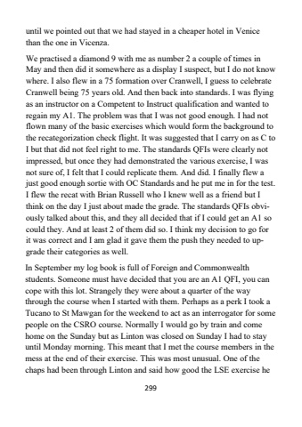 299until we pointed out that we had stayed in a cheaper hotel in Venice than the one in Vicenza.We practised a diamond 9 with me as number 2 a couple of times in May and then did it somewhere as a display I suspect, but I do not know where. I also flew in a 75 formation over Cranwell, I guess to celebrate Cranwell being 75 years old. And then back into standards. I was flying as an instructor on a Competent to Instruct qualification and wanted to regain my A1. The problem was that I was not good enough. I had not flown many of the basic exercises which would form the background to the recategorization check flight. It was suggested that I carry on as C to I but that did not feel right to me. The standards QFIs were clearly not impressed, but once they had demonstrated the various exercise, I was not sure of, I felt that I could replicate them. And did. I finally flew a just good enough sortie with OC Standards and he put me in for the test. I flew the recat with Brian Russell who I knew well as a friend but I think on the day I just about made the grade. The standards QFIs obviously talked about this, and they all decided that if I could get an A1 so could they. And at least 2 of them did so. I think my decision to go for it was correct and I am glad it gave them the push they needed to upgrade their categories as well. In September my log book is full of Foreign and Commonwealth students. Someone must have decided that you are an A1 QFI, you can cope with this lot. Strangely they were about a quarter of the way through the course when I started with them. Perhaps as a perk I took a Tucano to St Mawgan for the weekend to act as an interrogator for some people on the CSRO course. Normally I would go by train and come home on the Sunday but as Linton was closed on Sunday I had to stayuntil Monday morning. This meant that I met the course members in the mess at the end of their exercise. This was most unusual. One of the chaps had been through Linton and said how good the LSE exercise he