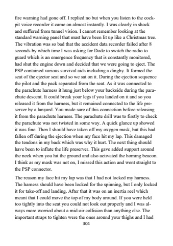 304fire warning had gone off. I replied no but when you listen to the cockpit voice recorder it came on almost instantly. I was clearly in shock and suffered from tunnel vision. I cannot remember looking at the standard warning panel that must have been lit up like a Christmas tree. The vibration was so bad that the accident data recorder failed after 8 seconds by which time I was asking for Dode to switch the radio to guard which is an emergence frequency that is constantly monitored, had shut the engine down and decided that we were going to eject. The PSP contained various survival aids including a dinghy. It formed the seat of the ejector seat and so we sat on it. During the ejection sequence the pilot and the pack separated from the seat. As it was connected to the parachute harness it hung just below your backside during the parachute descent. It could break your legs if you landed on it and so you released it from the harness, but it remained connected to the life preserver by a lanyard. You made sure of this connection before releasing it from the parachute harness. The parachute drill was to firstly to check the parachute was not twisted in some way. A quick glance up showed it was fine. Then I should have taken off my oxygen mask, but this had fallen off during the ejection when my face hit my lap. This damaged the tendons in my back which was why it hurt. The next thing should have been to inflate the life preserver. This gave added support around the neck when you hit the ground and also activated the homing beacon. I think as my mask was not on, I missed this action and went straight to the PSP connector. The reason my face hit my lap was that I had not locked my harness. The harness should have been locked for the spinning, but I only locked it for take-off and landing. After that it was on an inertia reel which meant that I could move the top of my body around. If you were held too tightly into the seat you could not look out properly and I was always more worried about a mid-air collision than anything else. The important straps to tighten were the ones around your thighs and I had