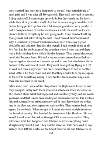 306very worried that may have happened to me as I was complaining of back pain and I was after all 50 years old. They said they had to take my flying jacket off. I went to get up to do it, but they made me lie down while they slowly worked it off. As I had been walking around the field before being picked up this was a bit annoying and also very painful. I had a complete team of doctors and nurses while the chief doctor explained to them everything he was going to do. They then took off my flying boots and asked if my toe hurt. I told them it didn%u2019t and asked why. He held up my boot which had a tear over where my big toe should be and told me I had lost the toenail. I had no pain there at all. My foot had hit the bottom of the coaming when I went out and there was a bolt sticking down which did the damage. They turned that round on all the Tucanos later. We had a leg restraint system that pulled our legs up against the seat as it moved up and so our feet should not hit the bottom of the instrument panel. They must have got my flying suit off as well and then x-rayed me. We were then both put to bed in another ward. After a bit they came and said that they needed to x-ray me again as there was something wrong. They did this from another angle and then sent me back to the ward.After some time, some of the chaps from the flight came to see us and they brought Gabby with them who burst into tears when she came in. We chatted about what had happened and eventually they said we could go home, and that Linton was sending an ambulance for us. The visitors left and eventually an ambulance arrived. It must have been the oldest one in the fleet and the suspension was terrible. That journey back was agony for my back. When we got to Linton, we went straight in to see the board of inquiry. The head of the board was John Houlton . He was an old friend who I had taken through CFS many years earlier. They asked me what had happened and told me to write everything down straight away which I did. They did the same to Dode but asked us separately. As I left the doctor on the board came to me and told me to be
