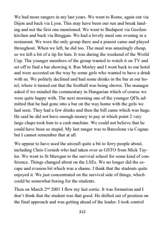 312We had more rangers in my last years. We went to Rome, again out via Dijon and back via Lyon. This may have been our run and break landing and not the first one mentioned. We went to Budapest via Geeilenkirchen and back via Bruggan. We had a lovely meal one evening in a restaurant. We were the only group there and a pianist came and played throughout. When we left, he did too. The meal was amazingly cheap, so we left a bit of a tip for him. It was during the weekend of the World Cup. The younger members of the group wanted to watch it on TV and set off to find a bar showing it. Rus Morley and I went back to our hotel and were accosted on the way by some girls who wanted to have a drink with us. We politely declined and had some drinks in the bar at our hotel, where it turned out that the football was being shown. The manager asked if we minded the commentary in Hungarian which of course we were quite happy with. The next morning one of the younger QFIs admitted that he had gone into a bar on the way home with the girls we had seen. They had a few drinks and then the bill came which was huge. He said he did not have enough money to pay at which point 2 very large chaps took him to a cash machine. We could not believe that he could have been so stupid. My last ranger was to Barcelona via Cognac but I cannot remember that at all.We appear to have used the aircraft quite a bit to ferry people about, including Chris Cornish who had taken over as GSTO from Mick Taylor. We went to St Mawgan to the survival school for some kind of conference. Things changed about on the LSEs. We no longer did the escape and evasion bit which was a shame. I think that the students quite enjoyed it. We just concentrated on the survival side of things, which could be somewhat boring for the students.Then on March 2nd 2001 I flew my last sortie. It was formation and I don%u2019t think that the student was that good. He drifted out of position on the final approach and was getting ahead of the leader. I took control