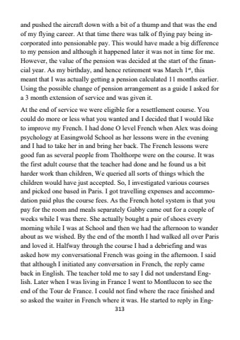 313and pushed the aircraft down with a bit of a thump and that was the end of my flying career. At that time there was talk of flying pay being incorporated into pensionable pay. This would have made a big difference to my pension and although it happened later it was not in time for me. However, the value of the pension was decided at the start of the financial year. As my birthday, and hence retirement was March 1st, this meant that I was actually getting a pension calculated 11 months earlier. Using the possible change of pension arrangement as a guide I asked for a 3 month extension of service and was given it. At the end of service we were eligible for a resettlement course. You could do more or less what you wanted and I decided that I would like to improve my French. I had done O level French when Alex was doing psychology at Easingwold School as her lessons were in the evening and I had to take her in and bring her back. The French lessons were good fun as several people from Tholthorpe were on the course. It was the first adult course that the teacher had done and he found us a bit harder work than children, We queried all sorts of things which the children would have just accepted. So, I investigated various courses and picked one based in Paris. I got travelling expenses and accommodation paid plus the course fees. As the French hotel system is that you pay for the room and meals separately Gabby came out for a couple of weeks while I was there. She actually bought a pair of shoes every morning while I was at School and then we had the afternoon to wander about as we wished. By the end of the month I had walked all over Paris and loved it. Halfway through the course I had a debriefing and was asked how my conversational French was going in the afternoon. I said that although I initiated any conversation in French, the reply came back in English. The teacher told me to say I did not understand English. Later when I was living in France I went to Montlucon to see the end of the Tour de France. I could not find where the race finished and so asked the waiter in French where it was. He started to reply in Eng-
