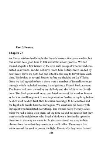316Part 3 France.Chapter 27As I have said we had bought the French house a few years earlier, but this would be a good time to talk about the whole process. We had looked at quite a few houses in the area with an agent who we had contacted in advance. We did not have much time as trips were limited by how much leave we both had and it took a full day to travel there each time. We looked at several houses before we decided on La Villatte. Once we had agreed to buy it there were a number of formalities to go through which included insuring it and getting a French bank account.The house had been owned by an old lady and she left it to her 3 children. The final paperwork was completed in one of the vendors houses as he was too ill to go out. It was important to finalise everything before he died as if he died first, then his share would go to his children and the legal side would have to start again. We went into his house with our agent who translated everything. The owners were friendly, and I think we had a drink with them. At the time we did not realise that they were actually neighbours who lived a bit down a lane in the opposite direction to the way we came in. In the years ahead we used to buy cheese from them that they made in a small cellar. There were live wires around the roof to power the light. Eventually they were banned