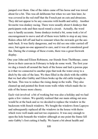 320jumped over them. One of the riders came off his horse and was towed about for a bit. This was all deliberate but when we saw him later, he was covered in the red stuff that the French put on cuts and abrasions. They did not appear to be any concerns with health and safety. Another favourite was donkey racing. There were usually about 6 donkeys that participants rode and then raced round a circuit. Actually, the word race is hardly accurate. Some donkeys trotted a bit, some took a lot of encouragement to move and all of them were liable to stop at any time. Riders often fell off and had to remount when the stewards got the animals back. It was fairly dangerous, and we did see one rider carried off once, but again no-one appeared to care, and it was all considered good fun. During the evenings of these events, there was a great firework display. One year John and Eileen Robinson, our friends from Tholthorpe, came down in their caravan in February to help do some work. The first year we dug a trench all around the back of the house and laid a porous pipe in it that we connected to another pipe that took the water away to a ditch by the side of the lane. We then filled in the ditch with the rubble that we had after Gabby and Eileen broke up the old cattle troughs in the barn. This was to reduce the rising damp in the walls. They also cleaned up and painted the front room walls white which made the inside of the house more cheery.Each visit involved a bit of working but was also a holiday and we had quite a few visitors. We quickly realised that our main sitting out area would be at the back and so we decided to replace the window in the backroom with french windows. We bought the windows from Lapeyre and subsequently replaced all the windows in the house with theirs which were well made and not too expensive. It was easy enough to open the hole beneath the window although at one point the frame fell onto Gabby%u2019s foot cutting it badly. We learnt a bit about health and