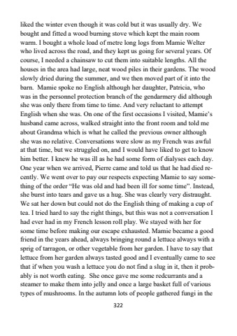 322liked the winter even though it was cold but it was usually dry. We bought and fitted a wood burning stove which kept the main room warm. I bought a whole load of metre long logs from Mamie Welter who lived across the road, and they kept us going for several years. Of course, I needed a chainsaw to cut them into suitable lengths. All the houses in the area had large, neat wood piles in their gardens. The wood slowly dried during the summer, and we then moved part of it into the barn. Mamie spoke no English although her daughter, Patricia, who was in the personnel protection branch of the gendarmery did although she was only there from time to time. And very reluctant to attempt English when she was. On one of the first occasions I visited, Mamie%u2019s husband came across, walked straight into the front room and told me about Grandma which is what he called the previous owner although she was no relative. Conversations were slow as my French was awful at that time, but we struggled on, and I would have liked to get to know him better. I knew he was ill as he had some form of dialyses each day. One year when we arrived, Pierre came and told us that he had died recently. We went over to pay our respects expecting Mamie to say something of the order %u201cHe was old and had been ill for some time%u201d. Instead,she burst into tears and gave us a hug. She was clearly very distraught. We sat her down but could not do the English thing of making a cup of tea. I tried hard to say the right things, but this was not a conversation I had ever had in my French lesson roll play. We stayed with her for some time before making our escape exhausted. Mamie became a good friend in the years ahead, always bringing round a lettuce always with a sprig of tarragon, or other vegetable from her garden. I have to say that lettuce from her garden always tasted good and I eventually came to see that if when you wash a lettuce you do not find a slug in it, then it probably is not worth eating. She once gave me some redcurrants and a steamer to make them into jelly and once a large basket full of various types of mushrooms. In the autumn lots of people gathered fungi in the