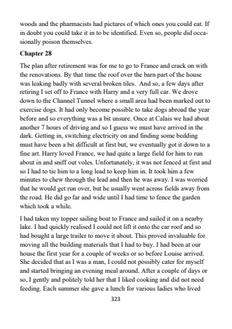 323woods and the pharmacists had pictures of which ones you could eat. If in doubt you could take it in to be identified. Even so, people did occasionally poison themselves. Chapter 28 The plan after retirement was for me to go to France and crack on with the renovations. By that time the roof over the barn part of the house was leaking badly with several broken tiles. And so, a few days after retiring I set off to France with Harry and a very full car. We drove down to the Channel Tunnel where a small area had been marked out to exercise dogs. It had only become possible to take dogs abroad the year before and so everything was a bit unsure. Once at Calais we had about another 7 hours of driving and so I guess we must have arrived in the dark. Getting in, switching electricity on and finding some bedding must have been a bit difficult at first but, we eventually got it down to a fine art. Harry loved France, we had quite a large field for him to run about in and sniff out voles. Unfortunately, it was not fenced at first and so I had to tie him to a long lead to keep him in. It took him a few minutes to chew through the lead and then he was away. I was worried that he would get run over, but he usually went across fields away from the road. He did go far and wide until I had time to fence the garden which took a while.I had taken my topper sailing boat to France and sailed it on a nearby lake. I had quickly realised I could not lift it onto the car roof and so had bought a large trailer to move it about. This proved invaluable for moving all the building materials that I had to buy. I had been at our house the first year for a couple of weeks or so before Louise arrived. She decided that as I was a man, I could not possibly cater for myself and started bringing an evening meal around. After a couple of days or so, I gently and politely told her that I liked cooking and did not need feeding. Each summer she gave a lunch for various ladies who lived