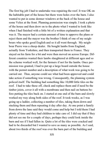 325The first big job I had to undertake was repairing the roof. It was OK on the habitable part of the house but there were holes over the barn. I also wanted to put in some dormer windows at the back of the house and some Velux at the front. Planning permission was simple. I took a photo of the house and then drew on to the photo what I wanted to look like when I had finished with a little bit of a written explanation and that was it. The mayor had a certain amount of time to approve the plans or reject them and the mayor was the brother I think of one of my neighbours who spoke good English and so it all went through. My neighbour Pierre was a sheep dealer. He bought lambs from England, actually from Yorkshire, and then transported them to France. They stayed on his farm for a bit and were then moved on across Europe. Different countries wanted their lambs slaughtered at different ages and so the scheme worked well, for the farmers if not for the lambs. Once permission was granted, I had to put up a large board outside the house with the permit number and a description of what work was going to be carried out. Thus, anyone could see what had been approved and could take action if something was wrong. Consequently, the planning system policed itself. The building had something like 10,000 little tiles on the roof. I had to take these off, check and replace them and if need be thetimber joists, cover it all with a membrane and then nail on battens before putting the tiles back on. I started at one end of the barn and slowly worked my way along both sides of the roof. It took weeks, as I was going up a ladder, collecting a number of tiles, taking them down and stacking them and then repeating it day after day. At one point a family from down the lane said they would come and help but I told them I had plenty of time and they had children to take care of. I did say that if they did not see me for a couple of days, perhaps they could look inside the barn and see if I had fallen in. Quite a lot of the tiles were cracked and had to be discarded but I wanted to save as many as possible. As I said, about two thirds of the roof was over the barn part of the building and