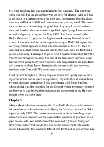 37My final handling test was again held in foul weather. The upper air work was OK but the cloud base was too low for circuits. And so I had to do those in a separate sortie the next day. I remember that the cloud base was still blow 1000ft and there was a very strong wind. This made the circuits very demanding but good fun. Any way I passed and we then just finished the course with a spell of night flying. I was commissioned and got my wings on 26 May 1967. And I was awarded the Hicks Memorial Trophy for the highest marks in my Ground School exams. I was selected for multi engine training at RAF Oakington but no flying course appears to flow one into another in the RAF then as now and so as that course was not due to start until July we first had a period of holding. I arranged to go to RAF Gaydon where they flew the Varsity for navigator training. On one of the trips from Gaydon, I saw that we were going to fly over Cranwell and suggested to the pilot that I call them to let them know. Immediately the navs said that we were nowhere near Cranwell. We went right over the top! I had by now bought a Hillman Imp car which was sporty and so moving around was not so much of a problem. Up until then it had all been by train although sometimes, I had gone home with Peter Bedford whose father was the test pilot for the Kestrel which eventually became the Harrier. It was interesting looking at all the aircraft in the Hawker hanger when we were there.Chapter 5After a short refresher course on the JP at RAF Manby which seemed a bit pointless as at Gaydon we were flying the Varsity, I started at Oakington in July 1967. The course was to teach us about handling larger aircraft and concentrated on the asymmetric problem. If you lose an engine on one side, you must correct the yaw and if you are flying too slowly the rudder will not do this and so the aircraft will roll and descend. Obviously, this could be fatal at low level and so you always had