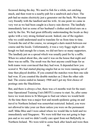 41focussed during the day. We used to fish for a while, not catchingmuch, and then went to a nearby pub for a sandwich and a beer. The pub had no mains electricity just a generator out the back. We became very friendly with the landlord and his wife. At one point we came in very wet as we had been caught in a heavy rain shower. The landlady immediately lent us some of her husband%u2019s clothes and dried ours on a rack by the fire. We had great difficulty understanding the locals as they spoke with a very strong fenland accent. Indeed, one of the regulars who we could understand used to translate for us from time to time. Towards the end of the course, we arranged a darts match between our course and the locals. Unfortunately, it was a very foggy night so although we had enough for a team, we did not have so many supporters. The landlady put on a spread which was usually paid for by a raffle. When we asked about this, she said it was on the house that night and there was no raffle. The result was the best anyone could hope for as both teams were convinced that they had won. It depended how you scored it. We had started playing singles but as we were running out of time then played doubles. If you counted the matches won then one side had won. If you counted the double matches as 2 then the other side had. The course ended in January 1968 and I got my first choice of postings onto the Shackleton.But, and there is always a but, there was a 6 months wait for the maritime Operational Training Unit (MOTU) course to start. So, after some leave we went down to St Mawgan to find out where we would hold. At the time there was a major foot and mouth epidemic going on and travel to Northern Ireland was somewhat restricted. Indeed, you were not allowed to take your car there unless you were on the permanent staff. Mike Blee and I were asked where we would like to hold and we immediately said Singapore. We were told that was not going to happen and so we said we didn%u2019t really care apart from not Ballykelly in Northern Ireland. We were told to come back after lunch and were then