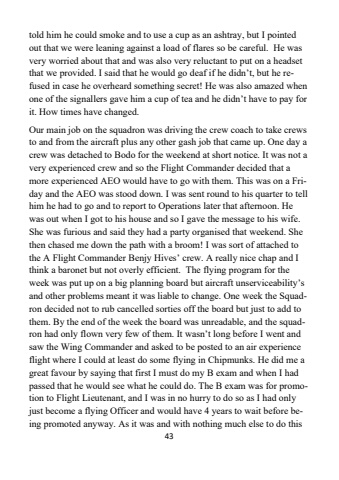 43told him he could smoke and to use a cup as an ashtray, but I pointed out that we were leaning against a load of flares so be careful. He was very worried about that and was also very reluctant to put on a headset that we provided. I said that he would go deaf if he didn%u2019t, but he refused in case he overheard something secret! He was also amazed when one of the signallers gave him a cup of tea and he didn%u2019t have to pay for it. How times have changed. Our main job on the squadron was driving the crew coach to take crews to and from the aircraft plus any other gash job that came up. One day a crew was detached to Bodo for the weekend at short notice. It was not a very experienced crew and so the Flight Commander decided that a more experienced AEO would have to go with them. This was on a Friday and the AEO was stood down. I was sent round to his quarter to tell him he had to go and to report to Operations later that afternoon. He was out when I got to his house and so I gave the message to his wife. She was furious and said they had a party organised that weekend. She then chased me down the path with a broom! I was sort of attached to the A Flight Commander Benjy Hives%u2019 crew. A really nice chap and I think a baronet but not overly efficient. The flying program for the week was put up on a big planning board but aircraft unserviceability%u2019sand other problems meant it was liable to change. One week the Squadron decided not to rub cancelled sorties off the board but just to add to them. By the end of the week the board was unreadable, and the squadron had only flown very few of them. It wasn%u2019t long before I went and saw the Wing Commander and asked to be posted to an air experience flight where I could at least do some flying in Chipmunks. He did me a great favour by saying that first I must do my B exam and when I had passed that he would see what he could do. The B exam was for promotion to Flight Lieutenant, and I was in no hurry to do so as I had only just become a flying Officer and would have 4 years to wait before being promoted anyway. As it was and with nothing much else to do this