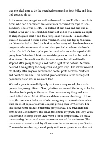 44was the ideal time to do the wretched exam and so both Mike and I settled down to do so. In the meantime, we got on well with one of the Air Traffic control officers who had a car which we sometimes borrowed for trips to Londonderry. There was no MOT in Ireland at that time and this was reflected in the car. The clutch had burnt out and so you needed a couple of chaps to push start it and then jump in as it moved. To make this worse it did about 4 miles before you had to stop and top up the radiator. You also had to bleed the brakes before every trip but these became progressively worse over time and then you had to rely on the handbrake. On Mike%u2019s last trip he put the handbrake on at the top of a hill going into Coleraine I think and used the gears as much as he could to slow down. The result was that he went down the hill and finally stopped after going through a red traffic light at the bottom. We then decided it was getting too dangerous and gave it up. The owner wrote it off shortly after anyway between the border posts between Northern and Southern Ireland. This caused great confusion in the subsequent paperwork as he was in no-mans land. We had a great time in Ballykelly as it was a very social place with quite a few young officers. Shortly before we arrived the living in bachelors had had a party in the mess. This became a big thing and was much talked about. Most officers and their wives wished to go. However, the bachelors had a list of who was going to be invited and when with the most popular married couples getting their invites first. The last invites went out just before the party started. The bachelors had been round Londonderry and asked just about any pretty girl they could find serving in shops etc so there were a lot of people there. To make more seating they spread some mattresses around the anti-room! The party went extremely well by all accounts but unfortunately the Station Commander was having a small party with some guests in another part