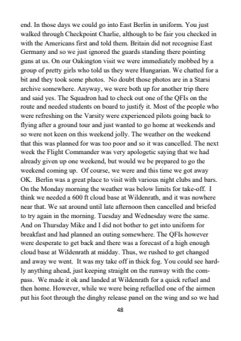 48end. In those days we could go into East Berlin in uniform. You just walked through Checkpoint Charlie, although to be fair you checked in with the Americans first and told them. Britain did not recognise East Germany and so we just ignored the guards standing there pointing guns at us. On our Oakington visit we were immediately mobbed by a group of pretty girls who told us they were Hungarian. We chatted for a bit and they took some photos. No doubt those photos are in a Starsi archive somewhere. Anyway, we were both up for another trip there and said yes. The Squadron had to check out one of the QFIs on the route and needed students on board to justify it. Most of the people who were refreshing on the Varsity were experienced pilots going back to flying after a ground tour and just wanted to go home at weekends and so were not keen on this weekend jolly. The weather on the weekend that this was planned for was too poor and so it was cancelled. The next week the Flight Commander was very apologetic saying that we had already given up one weekend, but would we be prepared to go the weekend coming up. Of course, we were and this time we got away OK. Berlin was a great place to visit with various night clubs and bars.On the Monday morning the weather was below limits for take-off. I think we needed a 600 ft cloud base at Wildenrath, and it was nowhere near that. We sat around until late afternoon then cancelled and briefed to try again in the morning. Tuesday and Wednesday were the same.And on Thursday Mike and I did not bother to get into uniform for breakfast and had planned an outing somewhere. The QFIs however were desperate to get back and there was a forecast of a high enough cloud base at Wildenrath at midday. Thus, we rushed to get changed and away we went. It was my take off in thick fog. You could see hardly anything ahead, just keeping straight on the runway with the compass. We made it ok and landed at Wildenrath for a quick refuel and then home. However, while we were being refuelled one of the airmen put his foot through the dinghy release panel on the wing and so we had