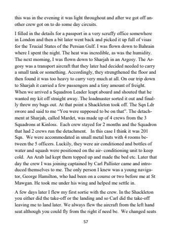57this was in the evening it was light throughout and after we got off another crew got on to do some day circuits.I filled in the details for a passport in a very scruffy office somewhere in London and then a bit later went back and picked it up full of visas for the Trucial States of the Persian Gulf. I was flown down to Bahrain where I spent the night. The heat was incredible, as was the humidity. The next morning, I was flown down to Sharjah in an Argosy. The Argosy was a transport aircraft that they later had decided needed to carry a small tank or something. Accordingly, they strengthened the floor andthen found it was too heavy to carry very much at all. On our trip down to Sharjah it carried a few passengers and a tiny amount of freight. When we arrived a Squadron Leader leapt aboard and shouted that he wanted my kit off straight away. The loadmaster sorted it out and finally threw my bags out. At that point a Shackleton took off. The Sqn Ldr swore and said to me %u201cYou were supposed to be on that%u201d. The detachment at Sharjah, called Mardet, was made up of 4 crews from the 3 Squadrons at Kinloss. Each crew stayed for 2 months and the Squadron that had 2 crews run the detachment. In this case I think it was 201 Sqn. We were accommodated in small metal huts with 4 rooms between the 5 officers. Luckily, they were air conditioned and bottles of water and squash were positioned on the air- conditioning unit to keep cold. An Arab lad kept them topped up and made the bed etc. Later that day the crew I was joining captained by Carl Pallister came and introduced themselves to me. The only person I knew was a young navigator, George Hamilton, who had been on a course or two before me at St Mawgan. He took me under his wing and helped me settle in.A few days later I flew my first sortie with the crew. In the Shackleton you either did the take-off or the landing and so Carl did the take-offleaving me to land later. We always flew the aircraft from the left hand seat although you could fly from the right if need be. We changed seats