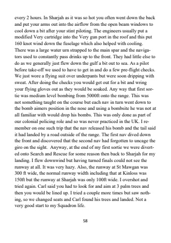 58every 2 hours. In Sharjah as it was so hot you often went down the back and put your arms out into the airflow from the open beam windows to cool down a bit after your stint piloting. The engineers usually put a modified Very cartridge into the Very gun port in the roof and this put 160 knot wind down the fuselage which also helped with cooling. There was a large water urn strapped to the main spar and the navigators used to constantly pass drinks up to the front. They had little else to do as we generally just flew down the gulf a bit out to sea. As a pilot before take-off we used to have to get in and do a few pre-flight checks. We just wore a flying suit over underpants but were soon dripping with sweat. After doing the checks you would get out for a bit and wring your flying gloves out as they would be soaked. Any way that first sortie was medium level bombing from 5000ft onto the range. This was not something taught on the course but each nav in turn went down to the bomb aimers position in the nose and using a bombsite he was not at all familiar with would drop his bombs. This was only done as part of our colonial policing role and so was never practiced in the UK. I remember on one such trip that the nav released his bomb and the tail said it had landed by a road outside of the range. The first nav dived down the front and discovered that the second nav had forgotten to uncage the giro on the sight. Anyway, at the end of my first sortie we were diverted onto Search and Rescue for some reason then back to Sharjah for my landing. I flew downwind but having turned finals could not see the runway at all. It was very hazy. Also, the runway at St Mawgan was 300 ft wide, the normal runway width including that at Kinloss was 150ft but the runway at Sharjah was only 100ft wide. I overshot and tried again. Carl said you had to look for and aim at 3 palm trees and then you would be lined up. I tried a couple more times but saw nothing, so we changed seats and Carl found his trees and landed. Not a very good start to my Squadron life.