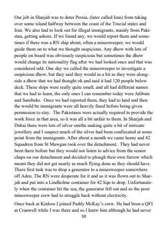 59Our job in Sharjah was to deter Persia, (later called Iran) from taking over some island halfway between the coast of the Trucial states and Iran. We also had to look out for illegal immigrants, mainly from Pakistan, getting ashore. If we found any, we would report them and sometimes if there was a RN ship about, often a minesweeper, we would guide them on to what we thought suspicious. Any dhow with lots of people on board was obviously suspicious but sometimes the dhow would change its nationality flag after we had looked once and that was considered odd. One day we called the minesweeper to investigate a suspicious dhow, but they said they would in a bit as they were alongside a dhow that we had thought ok and said it had 120 people below deck. These ships were really quite small, and all had different names that we had to learn, the only ones I can remember today were Jalibuts and Sambuks. Once we had reported them, they had to land and then the would be immigrants were all heavily fined before being given permission to stay. The Pakistanis were actually required to provide the work force in that area, so it was all a bit unfair to them. In Sharjah and Dubai there were lots of silver smiths making quite a bit of intricate jewellery and I suspect much of the silver had been confiscated at some point from the immigrants. After about a month we came home and 42 Squadron from St Mawgan took over the detachment. They had never been there before but they would not listen to advice from the senior chaps on our detachment and decided to plough their own furrow which meant they did not get nearly as much flying done as they should have.There first task was to drop a generator to a minesweeper somewhere off Aden. The RN were desperate for it and so it was flown out to Sharjah and put into a Lindholme container for 42 Sqn to drop. Unfortunately when the container hit the sea, the generator fell out and so the poor minesweeper crew had to struggle back without electricity.Once back at Kinloss I joined Paddy McKay%u2019s crew. He had been a QFI at Cranwell while I was there and so I knew him although he had never