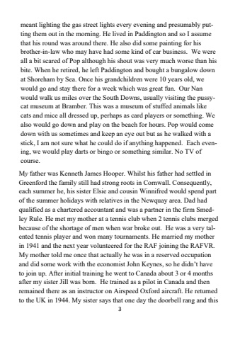 3meant lighting the gas street lights every evening and presumably putting them out in the morning. He lived in Paddington and so I assume that his round was around there. He also did some painting for his brother-in-law who may have had some kind of car business. We were all a bit scared of Pop although his shout was very much worse than his bite. When he retired, he left Paddington and bought a bungalow down at Shoreham by Sea. Once his grandchildren were 10 years old, we would go and stay there for a week which was great fun. Our Nan would walk us miles over the South Downs, usually visiting the pussycat museum at Bramber. This was a museum of stuffed animals like cats and mice all dressed up, perhaps as card players or something. We also would go down and play on the beach for hours. Pop would come down with us sometimes and keep an eye out but as he walked with a stick, I am not sure what he could do if anything happened. Each evening, we would play darts or bingo or something similar. No TV of course.My father was Kenneth James Hooper. Whilst his father had settled in Greenford the family still had strong roots in Cornwall. Consequently,each summer he, his sister Elsie and cousin Winnifred would spend part of the summer holidays with relatives in the Newquay area. Dad had qualified as a chartered accountant and was a partner in the firm Smedley Rule. He met my mother at a tennis club when 2 tennis clubs merged because of the shortage of men when war broke out. He was a very talented tennis player and won many tournaments. He married my mother in 1941 and the next year volunteered for the RAF joining the RAFVR. My mother told me once that actually he was in a reserved occupation and did some work with the economist John Keynes, so he didn%u2019t have to join up. After initial training he went to Canada about 3 or 4 months after my sister Jill was born. He trained as a pilot in Canada and then remained there as an instructor on Airspeed Oxford aircraft. He returned to the UK in 1944. My sister says that one day the doorbell rang and this