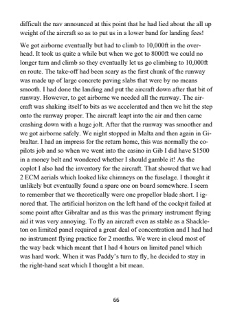 66difficult the nav announced at this point that he had lied about the all up weight of the aircraft so as to put us in a lower band for landing fees! We got airborne eventually but had to climb to 10,000ft in the overhead. It took us quite a while but when we got to 8000ft we could no longer turn and climb so they eventually let us go climbing to 10,000ft en route. The take-off had been scary as the first chunk of the runway was made up of large concrete paving slabs that were by no means smooth. I had done the landing and put the aircraft down after that bit of runway. However, to get airborne we needed all the runway. The aircraft was shaking itself to bits as we accelerated and then we hit the step onto the runway proper. The aircraft leapt into the air and then came crashing down with a huge jolt. After that the runway was smoother and we got airborne safely. We night stopped in Malta and then again in Gibraltar. I had an impress for the return home, this was normally the copilots job and so when we went into the casino in Gib I did have $1500 in a money belt and wondered whether I should gamble it! As the coplot I also had the inventory for the aircraft. That showed that we had 2 ECM aerials which looked like chimneys on the fuselage. I thought it unlikely but eventually found a spare one on board somewhere. I seem to remember that we theoretically were one propellor blade short. I ignored that. The artificial horizon on the left hand of the cockpit failed at some point after Gibraltar and as this was the primary instrument flying aid it was very annoying. To fly an aircraft even as stable as a Shackleton on limited panel required a great deal of concentration and I had had no instrument flying practice for 2 months. We were in cloud most of the way back which meant that I had 4 hours on limited panel which was hard work. When it was Paddy%u2019s turn to fly, he decided to stay in the right-hand seat which I thought a bit mean.