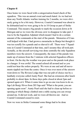 67Chapter 8Once home we were faced with a categorisation board check of the squadron. This was an annual event and much hated. As we had not done any North Atlantic warfare training for 2 months, we were obviously going to be a bit rusty. However, Coastal Command was about to be disbanded and we were going to be in 18 Group as part of Strike Command. This meant a big parade to mark the occasion down at St Mawgan and so we were the obvious crew to disappear to take part. I was to be the Squadron Adjutant which meant I had to do a certain amount of the commands at the start of the parade. Memories of Cranwell helped with that. I had grown a moustache in Sharja but thought it was too scruffy for a parade and so shaved it off. There were 7 Squadrons in Coastal Command at that time, and I assume they all took part. Actually, as the aircraft servicing was done centrally the only Squadron members were the aircrew. Consequently, the mass of the parade was made up of airmen from the 3 stations with selected Squadron officers in front. On the day the weather was poor and so the parade took place in a hanger. It was awful. The sound echoed all around and so you could not hear the orders properly. We were at one end and all movements rippled out from the centre. Once it was over most of the aircrew went down to The Riviera Lodge that was our pub of choice run by a landlady everyone called Aunty Pearl. She had an extension after lunch probably to about 4pm. In those days pubs closed at about 2pm and opened again at 6. When it came time to go no-one was keen to do so. Sqn Ldr Benjy Hives from 203 Sqn said %u201cWhat is the point, you are opening again soon%u201d. Aunty Pearl said she had to clean up before reopening at which Benjy climbed onto a table saying you can sweep around me. It did not work, and we were all thrown out. And soCoastal Command ceased to exist. Now we were in Strike Command some things had to be done