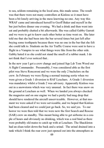 69to sea, seldom remaining in the local area, this made sense. The result was that there were not many controllers at Kinloss so it must have been a bit lonely arriving in the mess knowing no-one. Any way this WRAF came and introduced herself to Geoff Baker and myself in the bar just before dinner one evening. We had a drink and then went into eat and probably chatted a bit afterwards. She was called Gabby Garratt and we were to get to know each other better as time went on. She later told me that she had been into the bar several times but just left after buying some toothpaste because there was no one in the bar that she felt she could talk to. Students on the Air Traffic Course were sent to have a flight in a Vampire to see what things were like from the other side. Gabby hated it as she could not stand the smell of a rubber mask. I do not think that I ever noticed that.. In the new year I got a crew change and joined Sqn Ldr Tom Wood our A flight Commander. Presumably, I was considered able as the first pilot was Steve Roncoroni and we were the only 2 bachelors on the crew. In February we were flying a normal training sortie when we were given a Grade 1 diversion to RAF Leuchars. A Grade 1 diversion was mandatory whilst a Grade 2 was advisory. Apparently Kinloss was out in a snowstorm which was very unusual. In fact there was snow on the ground at Leuchars as well. When we landed you always checked the magnetos and on one engine we had a pretty bad mag drop that should have rendered the aircraft unserviceable. However, at that moment we were asked if we were serviceable, and we hoped that Kinloss had been cleared and we could just go back. So, we said yes. To our horror we were then told that we were now the first Search and Rescue (SAR) crew on standby. This meant being able to get airborne in a couple of hours and obviously no drinking, which was a real bind as there were probably old mates to catch up with at Leuchars. The Shackleton had an elsan toilet down the back and a urinal. The urinal drained into a tank which I think the rear crew just opened out into the atmosphere as