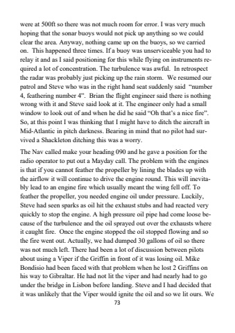 73were at 500ft so there was not much room for error. I was very much hoping that the sonar buoys would not pick up anything so we could clear the area. Anyway, nothing came up on the buoys, so we carried on. This happened three times. If a buoy was unserviceable you had to relay it and as I said positioning for this while flying on instruments required a lot of concentration. The turbulence was awful. In retrospect the radar was probably just picking up the rain storm. We resumed our patrol and Steve who was in the right hand seat suddenly said %u201cnumber4, feathering number 4%u201d. Brian the flight engineer said there is nothing wrong with it and Steve said look at it. The engineer only had a small window to look out of and when he did he said %u201cOh that%u2019s a nice fire%u201d. So, at this point I was thinking that I might have to ditch the aircraft in Mid-Atlantic in pitch darkness. Bearing in mind that no pilot had survived a Shackleton ditching this was a worry. The Nav called make your heading 090 and he gave a position for the radio operator to put out a Mayday call. The problem with the engines is that if you cannot feather the propeller by lining the blades up with the airflow it will continue to drive the engine round. This will inevitably lead to an engine fire which usually meant the wing fell off. To feather the propeller, you needed engine oil under pressure. Luckily,Steve had seen sparks as oil hit the exhaust stubs and had reacted very quickly to stop the engine. A high pressure oil pipe had come loose because of the turbulence and the oil sprayed out over the exhausts where it caught fire. Once the engine stopped the oil stopped flowing and so the fire went out. Actually, we had dumped 30 gallons of oil so there was not much left. There had been a lot of discussion between pilots about using a Viper if the Griffin in front of it was losing oil. Mike Bondisio had been faced with that problem when he lost 2 Griffins on his way to Gibraltar. He had not lit the viper and had nearly had to go under the bridge in Lisbon before landing. Steve and I had decided that it was unlikely that the Viper would ignite the oil and so we lit ours. We