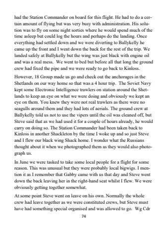 74had the Station Commander on board for this flight. He had to do a certain amount of flying but was very busy with administration. His solution was to fly on some night sorties where he would spend much of the time asleep but could log the hours and perhaps do the landing. Once everything had settled down and we were diverting to Ballykelly he came up the front and I went down the back for the rest of the trip. We landed safely at Ballykelly but the wing was just black with engine oil and was a real mess. We went to bed but before all that long the ground crew had fixed the pipe and we were ready to go back to Kinloss. However, 18 Group made us go and check out the anchorages in the Shetlands on our way home so that was a 4 hour trip. The Soviet Navy kept some Electronic Intelligence trawlers on station around the Shetlands to keep an eye on what we were doing and obviously we kept an eye on them. You knew they were not real trawlers as there were no seagulls around them and they had lots of aerials. The ground crew at Ballykelly told us not to use the vipers until the oil was cleaned off, but Steve said that as we had used it for a couple of hours already, he would carry on doing so. The Station Commander had been taken back to Kinloss in another Shackleton by the time I woke up and so just Steve and I flew our black wing Shack home. I wonder what the Russians thought about it when we photographed them as they would also photograph us.In June we were tasked to take some local people for a flight for some reason. This was unusual but they were probably local bigwigs. I mention it as I remember that Gabby came with us that day and Steve went down the back leaving her in the right-hand seat whilst I flew. We were obviously getting together somewhat. At some point Steve went on leave on his own. Normally the whole crew had leave together as we were constituted crews, but Steve must have had something special organised and was allowed to go. Wg Cdr
