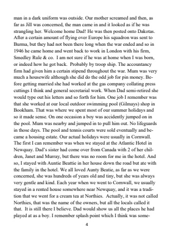 4man in a dark uniform was outside. Our mother screamed and then, as far as Jill was concerned, the man came in and it looked as if he was strangling her. Welcome home Dad! He was then posted onto Dakotas. After a certain amount of flying over Europe his squadron was sent to Burma, but they had not been there long when the war ended and so in 1946 he came home and went back to work in London with his firm, Smedley Rule & co. I am not sure if he was at home when I was born, or indeed how he got back. Probably by troop ship. The accountancy firm had given him a certain stipend throughout the war. Mum was very much a housewife although she did do the odd job for pin money. Before getting married she had worked at the gas company collating press cuttings I think and general secretarial work. When Dad semi-retired she would type out his letters and so forth for him. One job I remember was that she worked at our local outdoor swimming pool (Gilmays) shop in Bookham. That was where we spent most of our summer holidays and so it made sense. On one occasion a boy was accidently jumped on in the pool. Mum was nearby and jumped in to pull him out. No lifeguardsin those days. The pool and tennis courts were sold eventually and became a housing estate. Our actual holidays were usually in Cornwall. The first I can remember was when we stayed at the Atlantic Hotel in Newquay. Dad%u2019s sister had come over from Canada with 2 of her children, Janet and Murray, but there was no room for me in the hotel. And so, I stayed with Auntie Beattie in her house down the road but ate with the family in the hotel. We all loved Aunty Beatie, as far as we were concerned, she was hundreds of years old and tiny, but she was always very gentle and kind. Each year when we went to Cornwall, we usually stayed in a rented house somewhere near Newquay, and it was a tradition that we went for a cream tea at Northies. Actually, it was not called Northies, that was the name of the owners, but all the locals called it that. It is still there I believe. Dad would show us all the places he had played at as a boy. I remember splash point which I think was some-