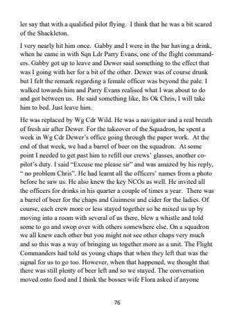 76ler say that with a qualified pilot flying. I think that he was a bit scared of the Shackleton.I very nearly hit him once. Gabby and I were in the bar having a drink, when he came in with Sqn Ldr Parry Evans, one of the flight commanders. Gabby got up to leave and Dewer said something to the effect that was I going with her for a bit of the other. Dewer was of course drunk but I felt the remark regarding a female officer was beyond the pale. I walked towards him and Parry Evans realised what I was about to do and got between us. He said something like, Its Ok Chris, I will take him to bed. Just leave him.He was replaced by Wg Cdr Wild. He was a navigator and a real breath of fresh air after Dewer. For the takeover of the Squadron, he spent a week in Wg Cdr Dewer%u2019s office going through the paper work. At the end of that week, we had a barrel of beer on the squadron. At some point I needed to get past him to refill our crews%u2019 glasses, another copilot%u2019s duty. I said %u201cExcuse me please sir%u201d and was amazed by his reply, %u201c no problem Chris%u201d. He had learnt all the officers%u2019 names from a photo before he saw us. He also knew the key NCOs as well. He invited all the officers for drinks in his quarter a couple of times a year. There was a barrel of beer for the chaps and Guinness and cider for the ladies. Of course, each crew more or less stayed together so he mixed us up by moving into a room with several of us there, blew a whistle and told some to go and swop over with others somewhere else. On a squadron we all knew each other but you might not see other chaps very much and so this was a way of bringing us together more as a unit. The Flight Commanders had told us young chaps that when they left that was the signal for us to go too. However, when that happened, we thought that there was still plenty of beer left and so we stayed. The conversation moved onto food and I think the bosses wife Flora asked if anyone