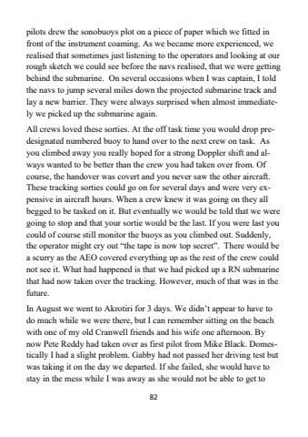 82pilots drew the sonobuoys plot on a piece of paper which we fitted in front of the instrument coaming. As we became more experienced, we realised that sometimes just listening to the operators and looking at our rough sketch we could see before the navs realised, that we were getting behind the submarine. On several occasions when I was captain, I told the navs to jump several miles down the projected submarine track and lay a new barrier. They were always surprised when almost immediately we picked up the submarine again.All crews loved these sorties. At the off task time you would drop predesignated numbered buoy to hand over to the next crew on task. As you climbed away you really hoped for a strong Doppler shift and always wanted to be better than the crew you had taken over from. Of course, the handover was covert and you never saw the other aircraft. These tracking sorties could go on for several days and were very expensive in aircraft hours. When a crew knew it was going on they all begged to be tasked on it. But eventually we would be told that we were going to stop and that your sortie would be the last. If you were last you could of course still monitor the buoys as you climbed out. Suddenly, the operator might cry out %u201cthe tape is now top secret%u201d. There would be a scurry as the AEO covered everything up as the rest of the crew could not see it. What had happened is that we had picked up a RN submarine that had now taken over the tracking. However, much of that was in the future.In August we went to Akrotiri for 3 days. We didn%u2019t appear to have to do much while we were there, but I can remember sitting on the beach with one of my old Cranwell friends and his wife one afternoon. By now Pete Reddy had taken over as first pilot from Mike Black. Domestically I had a slight problem. Gabby had not passed her driving test but was taking it on the day we departed. If she failed, she would have to stay in the mess while I was away as she would not be able to get to
