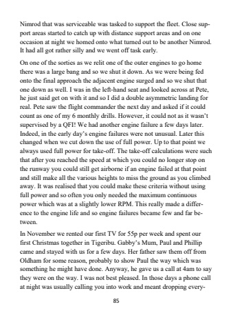 85Nimrod that was serviceable was tasked to support the fleet. Close support areas started to catch up with distance support areas and on one occasion at night we homed onto what turned out to be another Nimrod.It had all got rather silly and we went off task early. On one of the sorties as we relit one of the outer engines to go homethere was a large bang and so we shut it down. As we were being fed onto the final approach the adjacent engine surged and so we shut that one down as well. I was in the left-hand seat and looked across at Pete, he just said get on with it and so I did a double asymmetric landing for real. Pete saw the flight commander the next day and asked if it could count as one of my 6 monthly drills. However, it could not as it wasn%u2019t supervised by a QFI! We had another engine failure a few days later. Indeed, in the early day%u2019s engine failures were not unusual. Later this changed when we cut down the use of full power. Up to that point we always used full power for take-off. The take-off calculations were such that after you reached the speed at which you could no longer stop on the runway you could still get airborne if an engine failed at that point and still make all the various heights to miss the ground as you climbed away. It was realised that you could make these criteria without using full power and so often you only needed the maximum continuous power which was at a slightly lower RPM. This really made a difference to the engine life and so engine failures became few and far between.In November we rented our first TV for 55p per week and spent our first Christmas together in Tigeribu. Gabby%u2019s Mum, Paul and Phillip came and stayed with us for a few days. Her father saw them off from Oldham for some reason, probably to show Paul the way which was something he might have done. Anyway, he gave us a call at 4am to say they were on the way. I was not best pleased. In those days a phone call at night was usually calling you into work and meant dropping every-