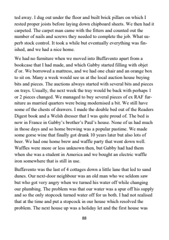 88ted away. I dug out under the floor and built brick pillars on which I rested proper joists before laying down chipboard sheets. We then had it carpeted. The carpet man came with the fitters and counted out the number of nails and screws they needed to complete the job. What superb stock control. It took a while but eventually everything was finished, and we had a nice home. We had no furniture when we moved into Buffavento apart from a bookcase that I had made, and which Gabby started filling with objet d%u2019or. We borrowed a mattress, and we had one chair and an orange box to sit on. Many a week would see us at the local auction house buying bits and pieces. The auctions always started with several bits and pieces on trays. Usually, the next week the tray would be back with perhaps 1 or 2 pieces changed. We managed to buy several pieces of ex RAF furniture as married quarters were being modernised a bit. We still have some of the chests of drawers. I made the double bed out of the Readers Digest book and a Welsh dresser that I was quite proud of. The bed is now in France in Gabby%u2019s brother%u2019s Paul%u2019s house. None of us had much in those days and so home brewing was a popular pastime. We made some gorse wine that finally got drunk 10 years later but also lots of beer. We had one home brew and waffle party that went down well. Waffles were more or less unknown then, but Gabby had had them when she was a student in America and we bought an electric waffle iron somewhere that is still in use. Buffavento was the last of 4 cottages down a little lane that led to sand dunes. Our next-door neighbour was an old man who we seldom saw but who got very angry when we turned his water off while changing our plumbing. The problem was that our water was a spur off his supply and so the only stopcock turned water off for us both. I had not realised that at the time and put a stopcock in our house which resolved the problem. The next house up was a holiday let and the first house was