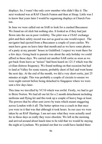 91displays. So, I wasn%u2019t the only crew member who didn%u2019t like it. The next weekend was at RAF Church Fenton and then at Sleap. Little was I to know that years later I would be organising displays at Church Fenton.In June we were called out on SAR to look for a crashed Buccaneer. We found an oil slick but nothing else. It looked as if they had just flown into the sea in poor visibility. The pilot was a USAF exchange pilot and their safety record was not as good as one would expect. The navigator had ejected from a Buccaneer a couple of years earlier. We must have gone on leave later that month and as we have some photos of a party at my parents%u2019 house in Guildford. I expect we went there for a few days. Going back to parents was about the only holiday we could afford in those days. We carried out another SAR sortie as soon as we got back from leave as %u201cnoises%u201d had been heard on 121.5 which was the civilian distress frequency. We found nothing on that occasion but had to land at Valley for some reason, probably short of fuel and went home the next day. At the end of the month, we did a very short sortie, just 25 minutes at night. This was probably a couple of circuits to ensure we were night current before being detached to Singapore where we were sent a few days later. This time we travelled by VC10 which was awful. Firstly, we had to get to Brize Norton. We had all our kit for a 2 month detachment including uniforms and flying kit and this took up a couple of heavy bags at least. The powers that be often sent crews by train which meant staggering across London with it all. The better option was a coach in that once you were in it that was that although it took hours. In our case we were taken by an RAF Hastings. I am not sure what they were actually used for in those days as really they were obsolete. We left in the morning and arrived around about lunch time to be told that we would be staying the night at Lyneham. We pointed out that we could have landed there