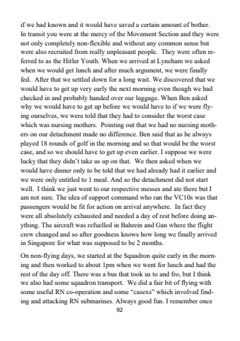 92if we had known and it would have saved a certain amount of bother. In transit you were at the mercy of the Movement Section and they were not only completely non-flexible and without any common sense but were also recruited from really unpleasant people. They were often referred to as the Hitler Youth. When we arrived at Lyneham we asked when we would get lunch and after much argument, we were finally fed. After that we settled down for a long wait. We discovered that we would have to get up very early the next morning even though we had checked in and probably handed over our luggage. When Ben asked why we would have to get up before we would have to if we were flying ourselves, we were told that they had to consider the worst case which was nursing mothers. Pointing out that we had no nursing mothers on our detachment made no difference. Ben said that as he always played 18 rounds of golf in the morning and so that would be the worst case, and so we should have to get up even earlier. I suppose we were lucky that they didn%u2019t take us up on that. We then asked when we would have dinner only to be told that we had already had it earlier and we were only entitled to 1 meal. And so the detachment did not start well. I think we just went to our respective messes and ate there but I am not sure. The idea of support command who ran the VC10s was that passengers would be fit for action on arrival anywhere. In fact they were all absolutely exhausted and needed a day of rest before doing anything. The aircraft was refuelled in Bahrein and Gan where the flight crew changed and so after goodness knows how long we finally arrived in Singapore for what was supposed to be 2 months.On non-flying days, we started at the Squadron quite early in the morning and then worked to about 1pm when we went for lunch and had the rest of the day off. There was a bus that took us to and fro, but I think we also had some squadron transport. We did a fair bit of flying with some useful RN co-operation and some %u201ccasexs%u201d which involved finding and attacking RN submarines. Always good fun. I remember once