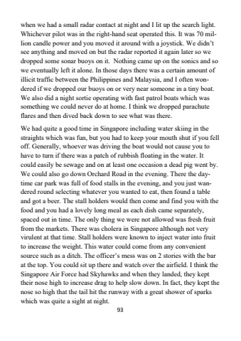 93when we had a small radar contact at night and I lit up the search light. Whichever pilot was in the right-hand seat operated this. It was 70 million candle power and you moved it around with a joystick. We didn%u2019t see anything and moved on but the radar reported it again later so we dropped some sonar buoys on it. Nothing came up on the sonics and so we eventually left it alone. In those days there was a certain amount of illicit traffic between the Philippines and Malaysia, and I often wondered if we dropped our buoys on or very near someone in a tiny boat. We also did a night sortie operating with fast patrol boats which was something we could never do at home. I think we dropped parachute flares and then dived back down to see what was there. We had quite a good time in Singapore including water skiing in the straights which was fun, but you had to keep your mouth shut if you fell off. Generally, whoever was driving the boat would not cause you to have to turn if there was a patch of rubbish floating in the water. It could easily be sewage and on at least one occasion a dead pig went by. We could also go down Orchard Road in the evening. There the daytime car park was full of food stalls in the evening, and you just wandered round selecting whatever you wanted to eat, then found a table and got a beer. The stall holders would then come and find you with the food and you had a lovely long meal as each dish came separately, spaced out in time. The only thing we were not allowed was fresh fruit from the markets. There was cholera in Singapore although not very virulent at that time. Stall holders were known to inject water into fruit to increase the weight. This water could come from any convenientsource such as a ditch. The officer%u2019s mess was on 2 stories with the bar at the top. You could sit up there and watch over the airfield. I think the Singapore Air Force had Skyhawks and when they landed, they kept their nose high to increase drag to help slow down. In fact, they kept the nose so high that the tail hit the runway with a great shower of sparks which was quite a sight at night.